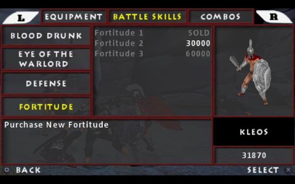 Leonidas can use Battle Skills after accumulating Wrath by attacking his foes. These battle skills can heal him, increase his damage, and defend him from arrows. Kleos can be used to further improve a Battle Skill, making it more effective. Combo attacks that stun enemies, deal extra damage, or knock targets down can also be bought with Kleos.