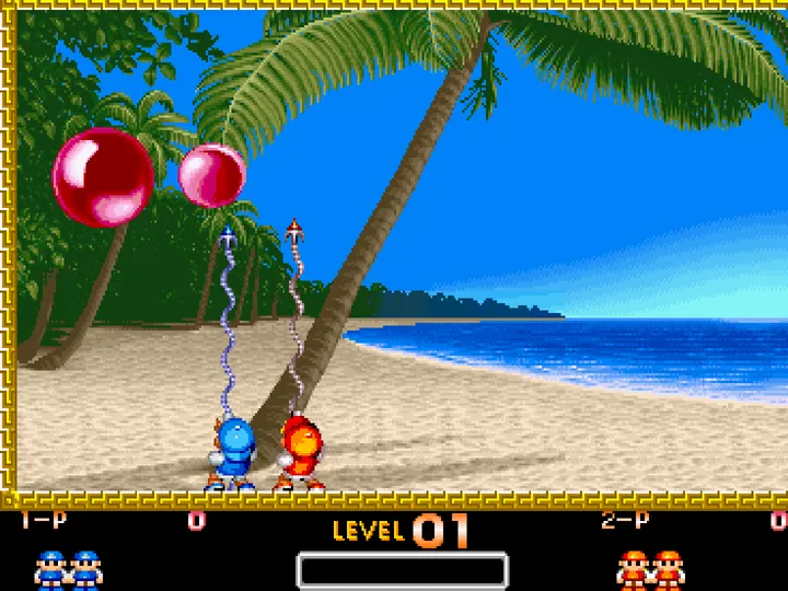 Buster Bros. Collection consists of three games: Buster Bros., Super Buster Bros., and Buster Buddies. While each title varies in terms of gameplay, the premise remains largely the same. Players must use a weapon called a Wire to pop balloons, which break into smaller ones that bounce around more quickly. Eliminate all of the balloons to complete each level. The Wire can only be be fired upwards, but players are free to move their character from left to right. Touching a balloon will result in the player losing a life. Each game starts out fairly simple, but the layout of the gameplay area becomes more complicated as the game progresses with obstacles like blocks appearing. Players can also acquire a number of different powerups based on which Buster Bros. Game they are playing. Buster Bros. Features upgrades like the Double Wire, while Buster Buddies offers players weapons like the the laser gun.