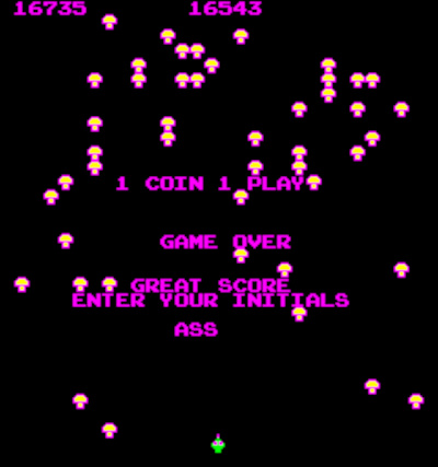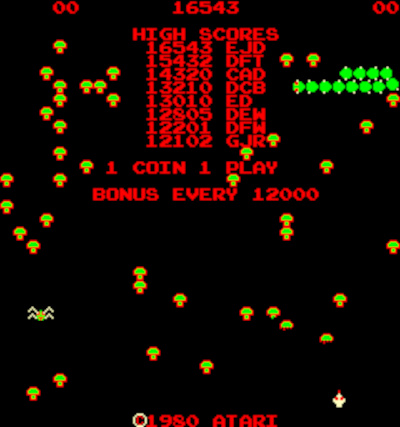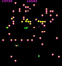 Games were starting to look better back in 1980, so Centipede has a good bit of detail. It can also generate quite a few colors. In fact, the color of the board changes every time the player destroys an entire centipede. This mostly affects the way the mushrooms look since their base color and their outline change, but it also impacts everything else. Some of the color combos are really nice, while others made my eyes bleed. Imagine bright yellow mushrooms outlined in purple blasting your retinas and you’ll have an idea of what Centipede is like.