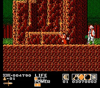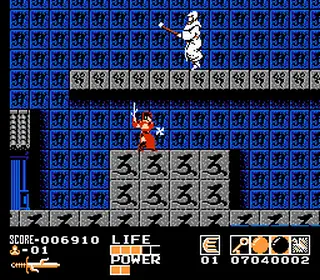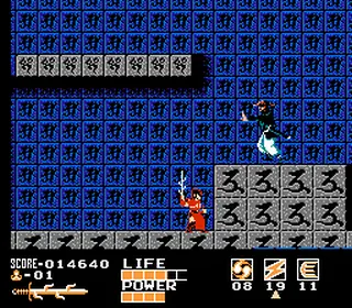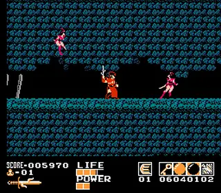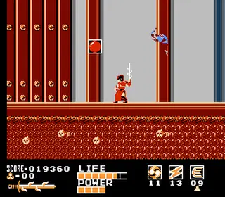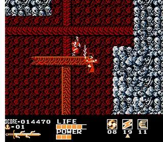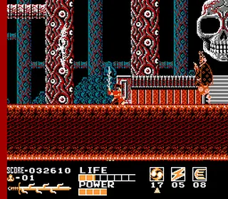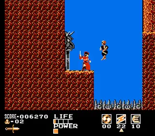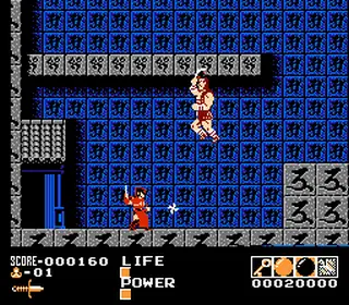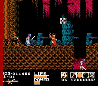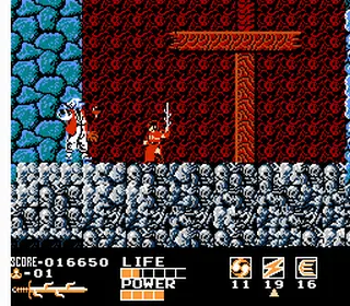 This stage is vertical and you will have to jump up a long series of ledges to get to the end. Running to the left or right will cause the screen to loop. More of the same old skeletons will appear, but you will also have to fight some new foes. The first is a sword wielding zombie that moves slowly. The zombies are not much of a threat, but they have a habit of spawning near Victar. The second new enemy is a female ninja clad in pink that runs very quickly. She also wields a sword with a fair bit of reach and throws darts. Jump out of the way when you see these female ninjas.