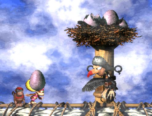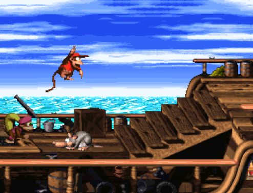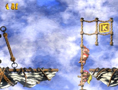 The action in Donkey Country 2 is largely the same with players jumping over pits, climbing ropes, and stomping Kremlings to proceed through each stage. A few new animal friends like Rattly the super high jumping snake, have been included. Diddy and Dixie also control differently from one another, with Diddy being a bit faster and Dixie being able to float using her pony tail.