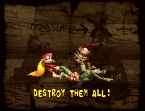 Kaptain K. Rool has kidnapped Donkey Kong and is holding him as ransom in exchange for his banana horde. It’s up to Diddy and a new playable character named Dixie to save Donkey Kong from the Kremlings. To do so, the must travel to the Kremlings home, Crocodile Island and battle their way through eight different areas which are broken up into many stages.