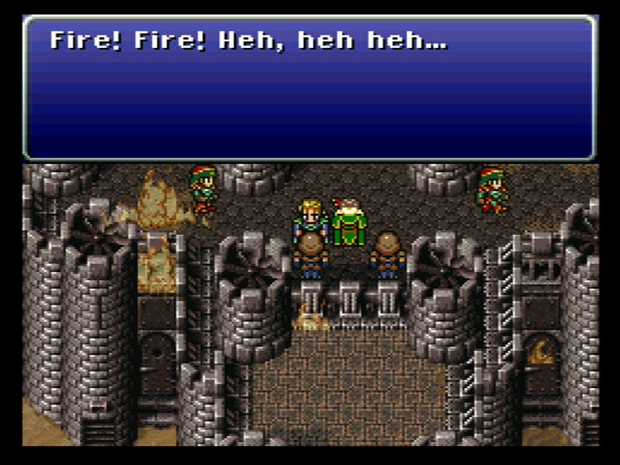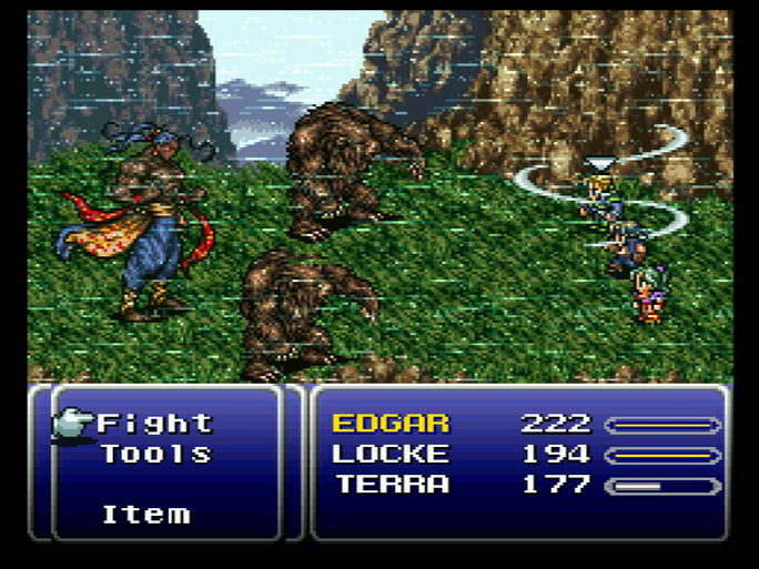 I’ve always thought Final Fantasy III was a dingy looking game, especially by the standards of the SNES. A lot of the environments are drab grays and browns, making the game world feel bleak. This may sound like a bad thing, but it fits the setting. After all, the heroes live in a world undergoing an industrial revolution and a catastrophic war at the same time. Whether it’s the icy streets of Narshe or the wide open Veldt, there always seems to be a shadow looming over the scene and the visuals grow increasingly somber as the story progresses. For the most part, the choice of color was really inspired, but it sometimes made the game feel lackluster compared to other Super Nintendo titles.