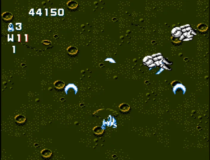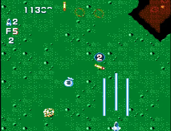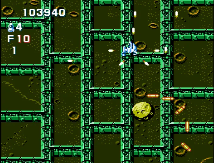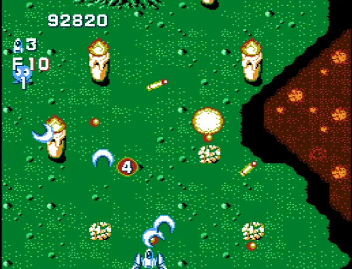 Gun Nac plays like most shmups. Each stage is packed with enemies and guarded by a boss at the end. Players will find a variety of power ups such as flame throwers, homing shots, spread shots, and lasers. Collecting a “P” power up will increase the strength of the player’s current weapon. Bombs with a number of different effects are also available. Collecting a Wing power up will allow the player to further strengthen his or her weapon and grants the ship and extra hit before being destroyed. Getting hit with the Wing equipped will result in the player losing it. Gun Nac also features a shop where players can use money found in each area to purchase upgrades.