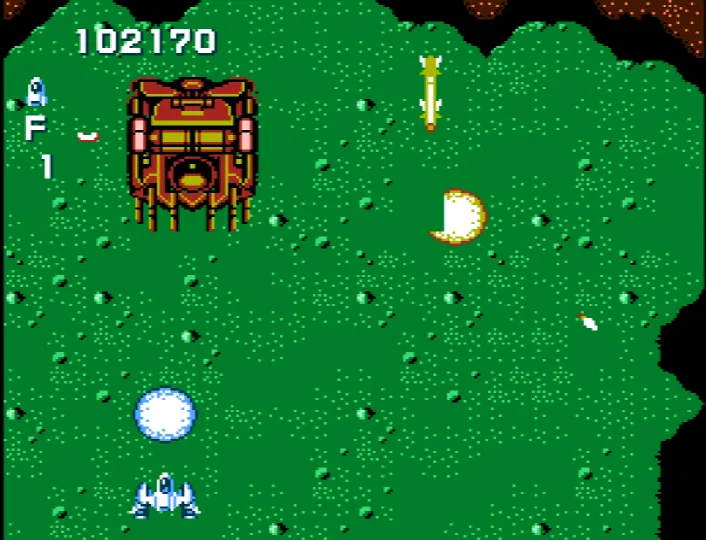 Gun Nac is a vertical shmup for the NES that stars a mysterious pilot codenamed “Gun-Nac”. A strange type of radiation has caused animals and inanimate objects in a once peaceful artificial solar system to come to life. Objects affected by the radiation are hostile and quickly start rampaging through out the solar system. It’s Gun-Nac’s job to investigate the mysterious energy, find its source, and put a stop to it.