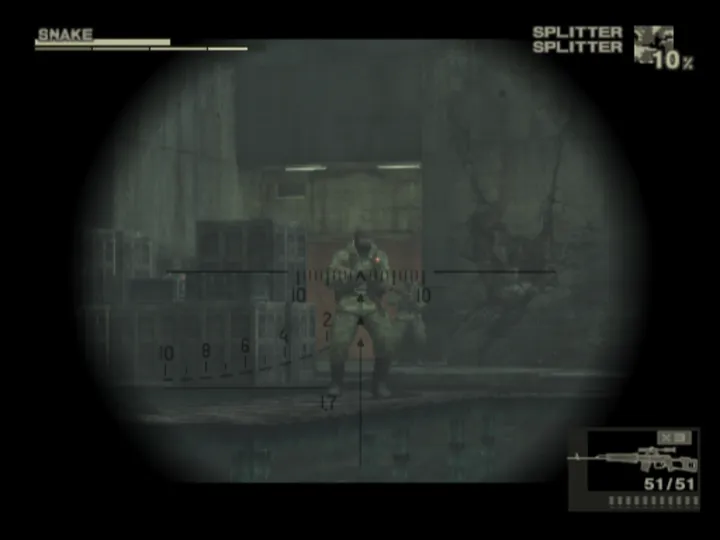 Metal Gear Solid 3 is a stealth action game at heart. Players are supposed to sneak around, avoiding or silently disabling foes. Getting spotted will alert the enemy and they will call for reinforcements. In such situations Snake either has to fight his way out or find a place to hide. Survival mechanics were also added into the mix. While characters constantly needing to eat and sleep has become a nuisance in video games over the years, it was fairly novel when MGS3 came out. Having to acquire food and feed Snake every ten minutes or so can get tedious, but Konami at least attempted to make it interesting by giving foods different effects. Players can even eat the things Snake kills right off the ground after he gets a fork. Yum!