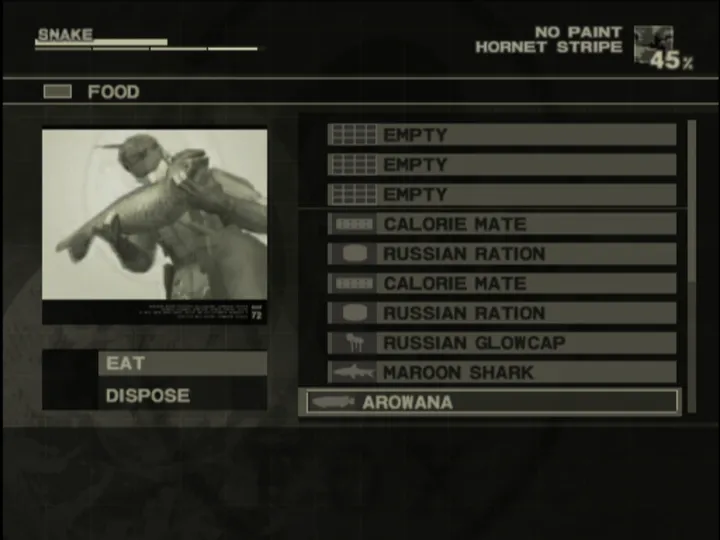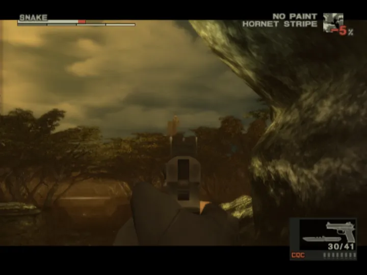 Like its predecessors, sneaking past enemies and silently infiltrating enemy territory is a huge part of MGS3. However, new survival mechanics have been added to the game. Snake must eat and will need to gather food from the forest to survive. Camouflage plays a major role in stealth and Snake will have to blend into his surroundings if he hopes to remain unseen. Many of the weapons and tools from previous games make a return in this title. Players will have access to various handguns, automatic rifles, grenades, and nonlethal tools like Night vision Goggles.