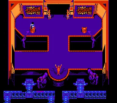 Smash T.V. is split into several stages (or circuits as the game calls them) that consist of mazes of enemy filled rooms. To complete a stage, you will have to find your way to the end point while defeating all of the enemies in each room you visit. Complete all of the circuits to win fabulous prizes and get out alive!