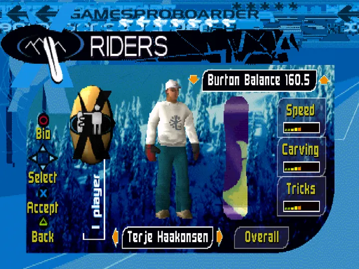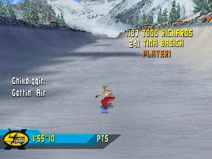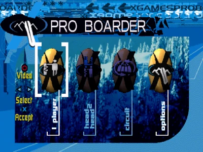 X Games Pro Boarder (sometimes known as ESPN X Games Pro Boarder) is a snowboarding game that allows players to perform stunts and race on a variety of tracks. Players can control professional snowboarders like Daniel Franck, Peter Line, and Tina Basich as well as some secret characters. The game features a standard single player mode, two player competition, and a special circuit mode that must be unlocked. Players can perform various tricks, pull off stunts on a half-pipe, and race. Many stages features obstacles that range from trees and signs to highway traffic.